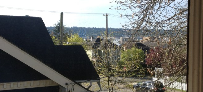 The view from the attic is beautiful. I see lovely old houses made to last. There are trees and in the distance the fraser river gleams with light. Patches of water eddy around sand. The fraser river is at low tide and there isn’t much water in it right now.